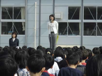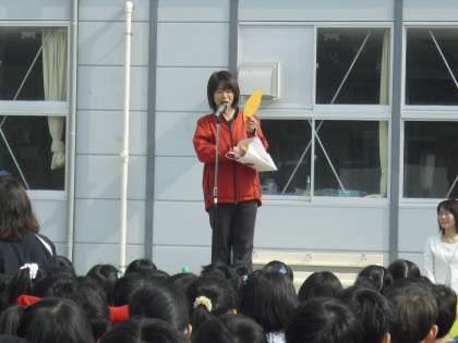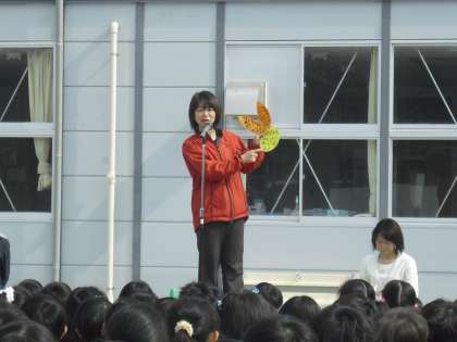 今月はあいさつ月間でもあります。生活指導主任の酒井先生は「進んで」あいさつするように心がけましょうという話をしました。生活指導部の山田先生は、具体的な取り組みについて話しました。子どもたちがあいさつのめあてを立て、めあてができると花びらが増えて花になります。たくさんのあいさつの花を咲かせます。