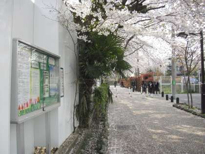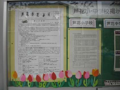 校舎の北側、遊歩道沿いにある掲示板です。芦花小学校は、学校だよりを拡大し、この掲示板に掲示しています。地域の方、道行く方にも学校への理解を深めていただく一助と考えています。
