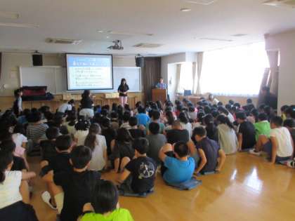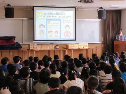 セーフティ教室の2時間目、5年生は中学校の視聴覚室をお借りして「スマホ・ケータイ安全教室」に参加しました。NTTドコモから講師をお招きして、一度発信された情報は、絶対消すことができないことを学びました。また、メールやラインにのせる際は相手にも伝わる内容にすることも実感していました。