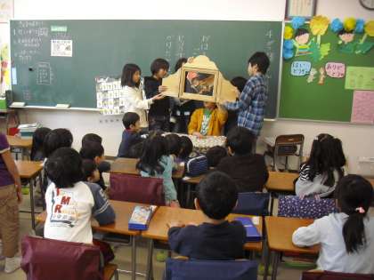1年生の教室の様子です。6年生が1年生に紙しばいを読み聞かせてあげていました。ほほえましい光景です。1年生は楽しそうに見入っていました。