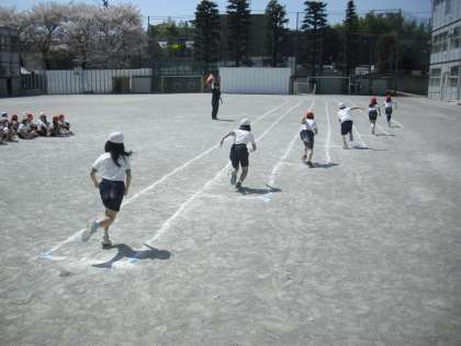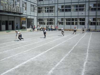 5年生の体育の授業の様子です。短距離走の計測をしているところです。短距離走では一定の距離を全力で走ることが求められます。スタートの走り出し、コーナーでの体重移動、ゴール前の加速がポイントです。