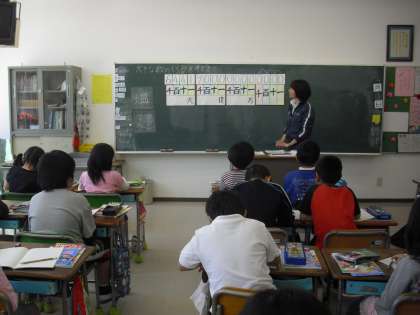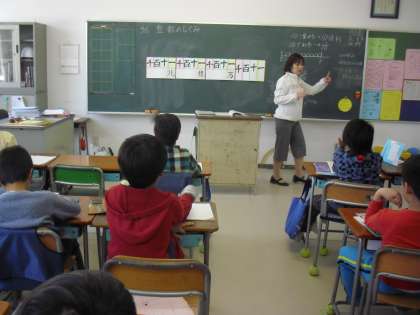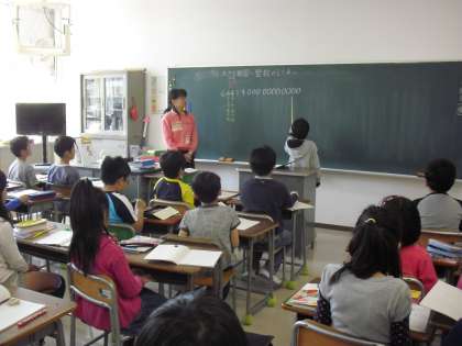 4年生の算数の授業の様子です。本校では、2年生以上が算数の時間に少人数指導を取り入れ、3クラスを4つのグループに分けて、子どもの実態に応じた、きめ細やかな指導を行っています。