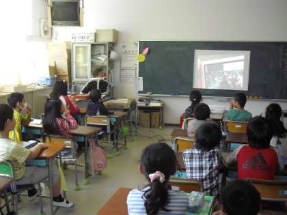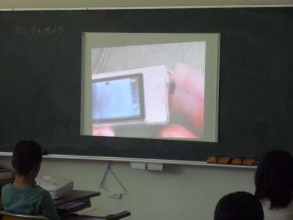 3年生の理科の授業の様子です。これから観察等で活用するデジタルカメラの使い方を学習しているところです。実物投影機で実物を使った説明を聞いているところです。様々な学習で効果的に活用します。