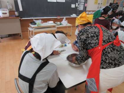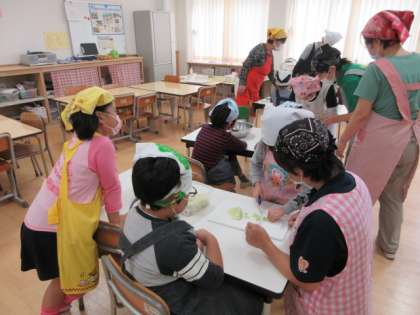 16日(水)の3・4時間目、ひかり学級は「生活単元」の時間でした。今回は、Bグループの子どもたちが調理を行いました。献立は「わかめご飯」「みそ汁」「焼き餃子」です。子どもたちは身支度を調えてから、野菜を切り始めました。