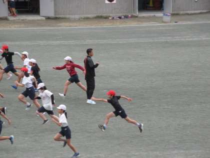 つま先立ち歩きの次は、かかとで歩くことをしました。体が「くの字」になりがちなので、これも姿勢を正し、目線を定めて歩くようにと言われました。他にも、大股で走ったり、友達と練習をしたりしました。最後に、連合運動会でリレーに出場する子どもたちに、バトンの渡し方を教えていただきました。