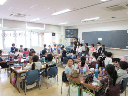 21日(月)、お弁当持参の32日目となりました。今週も子どもたちのお弁当作りをよろしくお願いいたします。写真はひかり学級と1年生の様子です。