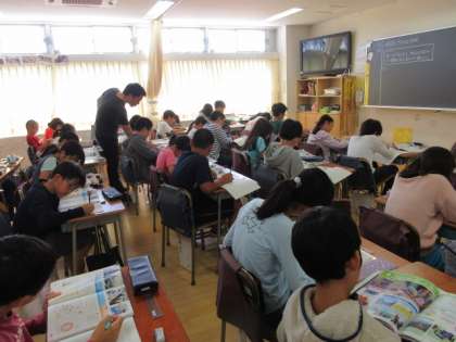 23日(水)の5時間目、5年2組は社会科の時間でした。「水産業」の学習で、「水揚げされたサンマがどのようにして届くのだろうか」を調べていました。教科書や資料集を使って、各自でまとめていました。
