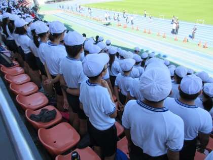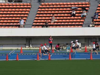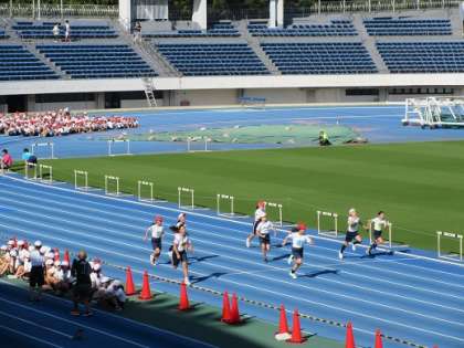会場の駒沢オリンピック公園総合運動場は、本格的な陸上競技場で、子どもたちは皆口々に「こんなすごいところでやるの?」と興奮気味でした。やや遅れて始まった開会式の後、まずは女子の100m走からスタートすると、他の競技でも熱戦が繰り広げられました。