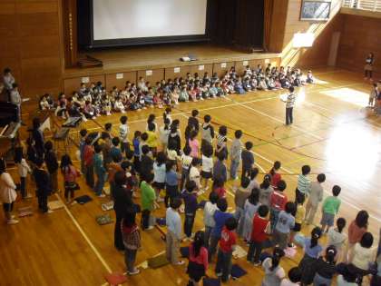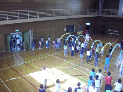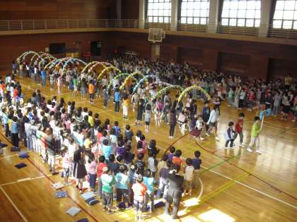1年生を迎える会の様子です。4年生が花のアーチで迎えています。1年生は仲良しパートナーの6年生と手をつないで入場です。みんなで大きな拍手で迎えています。