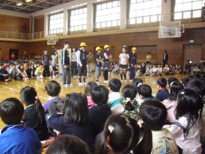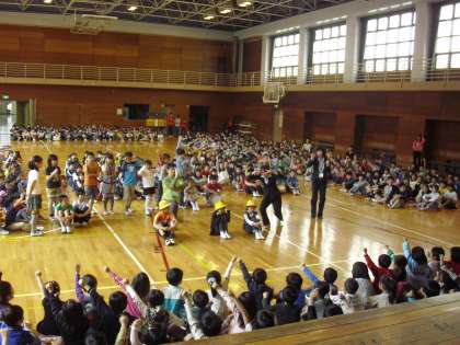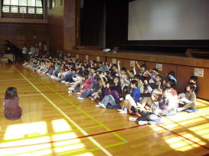 4年生による学校紹介の様子です。学校に関する問題をクイズ形式で1年生に出題します。3択問題で、1、2、3とそれぞれ違うポーズをとって正解だと思う番号のポーズをします。1なら「シュワッチ!」です。