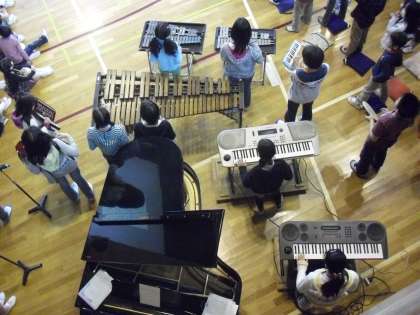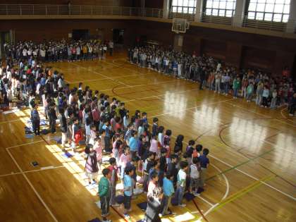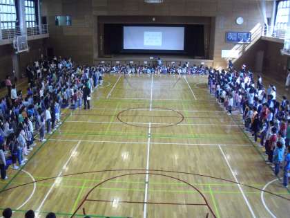 器楽委員会の演奏に合わせて、全員合唱「ビリーブ」を歌っているところです。きれいな歌声が体育館に響いています。