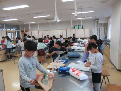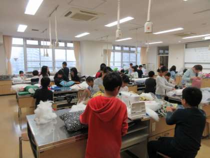 25日(金)の3・4時間目、5年2組は家庭科の時間でした。「オリジナル・クッション」の仕上げに取りかかっていました。綿をほぐしながら入れる作業と袋を閉じる作業をしました。子どもたちは、クッションのふわふわ感を楽しんでいました。