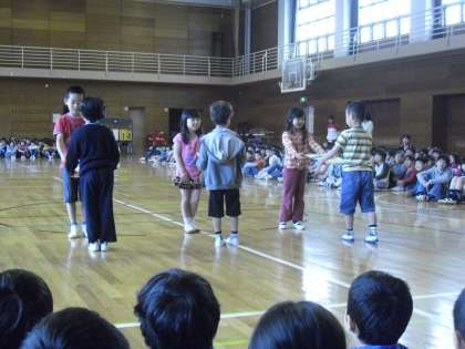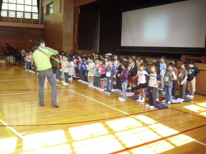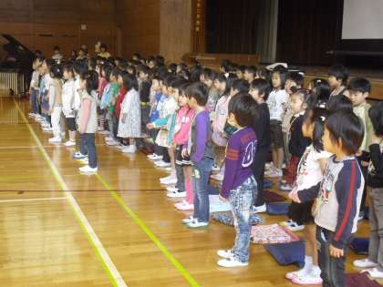 2年生からは、2年生が昨年育てたアサガオの種がプレゼントされました。その後は1年生のお礼の言葉と歌です。振りつきで元気よく歌を歌いました。入学して間もないのにとても上手でした。