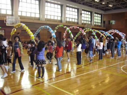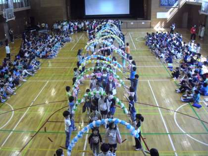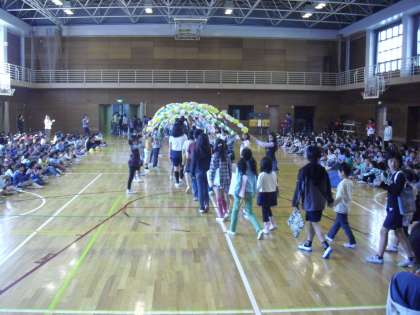 1年生が退場する様子です。入場と同じように仲良しパートナーの6年生と手をつないで退場です。みんなで1年生を迎えることができた会になりました。