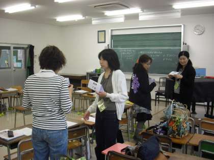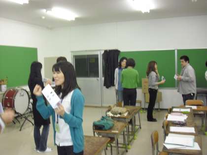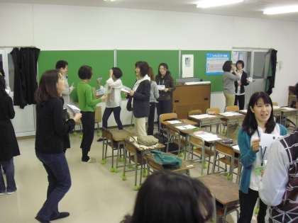 自由に室内を歩き、出会った人とあいさつを交わし、ジャンケンをします。勝った人は負けた人に簡単な質問をしながら会話を重ねていきます。これを時間内に何度も繰り返します。和やかな雰囲気になり、会を進行しました。