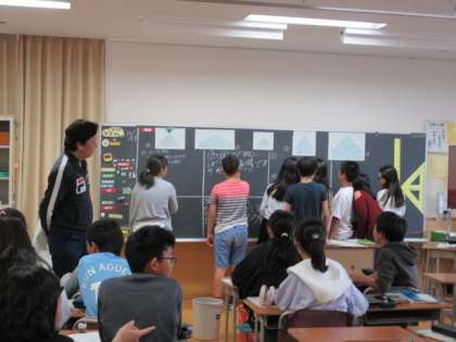 29日(火)の2時間目、6年1組と2組は算数の時間でした。3クラスに分かれて学習をしています。5つの五角形を比べて、同じところ、違うところを見付けました。各自で考えたものを班で共有し、黒板に書きました。最後は、直感を裏付ける根拠をデータから読み取ることができました。