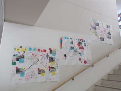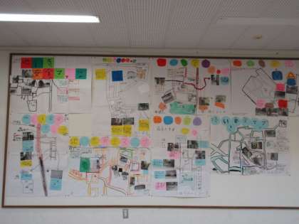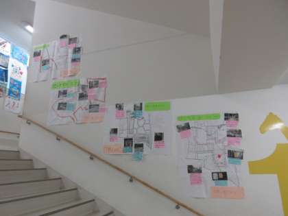 本校には幅の広い階段、通称「動物階段」があります。その階段の壁に3年生が取り組んだ「地域安全マップ」が掲示されました。各クラス各グループの取り組みがよくわかります。階段を行き来する他学年の子どもたちにもぜひ見てほしいです。
