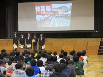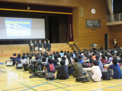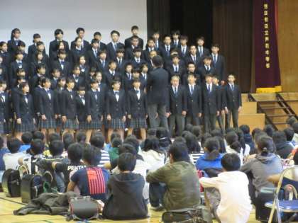 芦花中学校訪問の第2部は、新入生説明会でした。最初に、3年生が素晴らしい合唱を披露してくださいました。次に、生徒会の皆さんに、学校紹介をしていただきました。