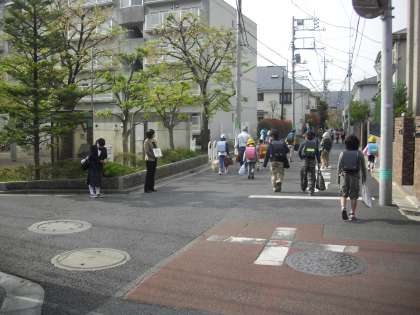 今朝のあいさつキャンペーンの様子です。写真は、郵政校舎前と西門です。地域サポーターカードを手に地域の方も協力してくださっています。