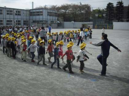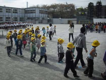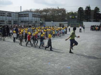 全校朝会が終了し、1年生が入室する様子です。担任が先頭に立ち、子どもたちを誘導しています。大きく手をふりながら行進です。きちんと列を保ったまま昇降口まで歩くことができました。