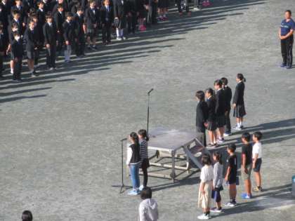 11月1日(金)の朝、校庭で小中合同集会を行いました。2回目となる今回は、小学校側が司会をしました。小学校の代表委員会、中学校の生徒会の順でそれぞれの取り組みについて紹介をしました。