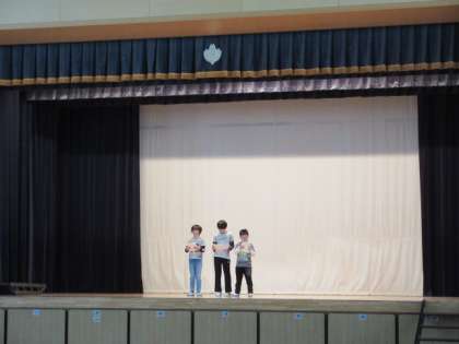 1日(金)の3時間目、ひかり学級は体育館で学芸会の初練習を行いました。役ごとにステージに立ち、体育館の後方にいる友達に向かって大きな声を出してせりふを言いました。見ていた子どもたちからは、「声が大きかった。」「よく聞こえた。」などの感想がありました。
