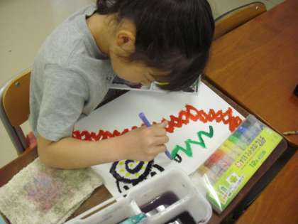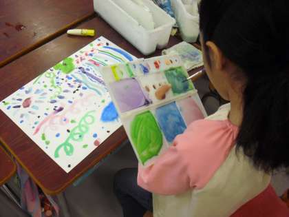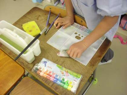 3年生の図工の授業の様子です。3年生は専科の佐藤先生が授業を行います。絵の具の使い方やパレットや水入れなどの用具のあつかい方や手入れの仕方を学習しました。用具が上手に使えるようになると表現の世界も広がります。