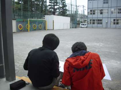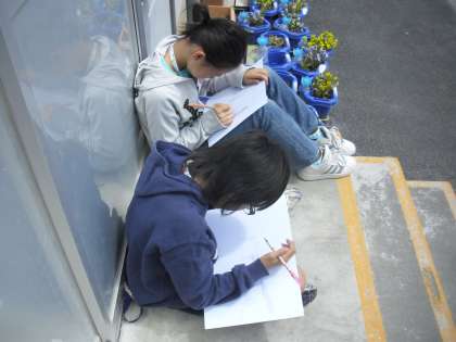 6年生の図工の授業の様子です。自分のお気に入りの学校の風景を描いているところです。今日のクラスは、校庭を選んだ子どもたちが10名ほどいました。校庭から見る校舎を描いたり、バスケットゴールを描いたりしています。