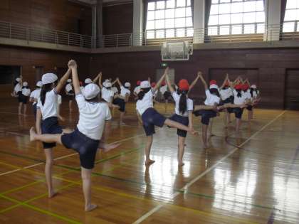 5年生の体育の授業の様子です。学年合同で、組体操の一人技や二人技を試しているところです。運動会では6年生といっしょに取り組む予定です。実態を踏まえて安全第一で行っていきます。