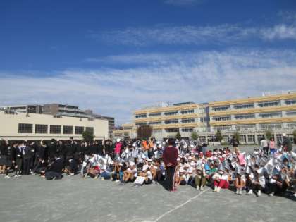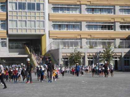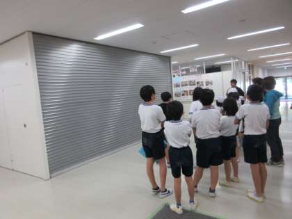 7日(木)、小中合同の避難訓練を実施しました。今回は小学校の家庭科室から出火したと想定して、防火シャッターを降ろし、防火扉を締めて訓練を行いました。訓練後、普段見ることのない防火シャッターや防火扉を見学しました。