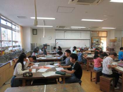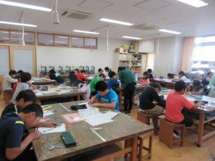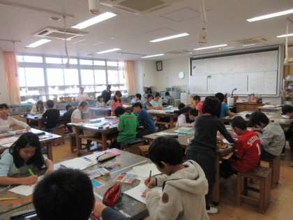 7日(木)の3・4時間目、5年2組は図画工作の時間でした。「見える見える 遠くに近くに」と題して、1枚の絵を遠近法を使っておもしろい絵にしていました。子どもたちは、集中して取り組んでいました。