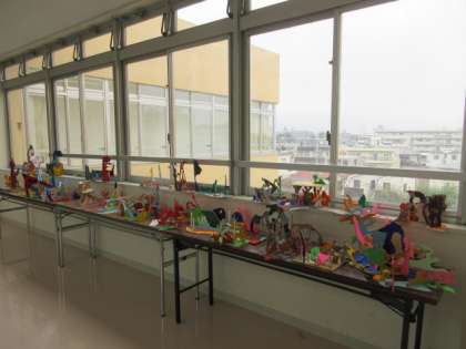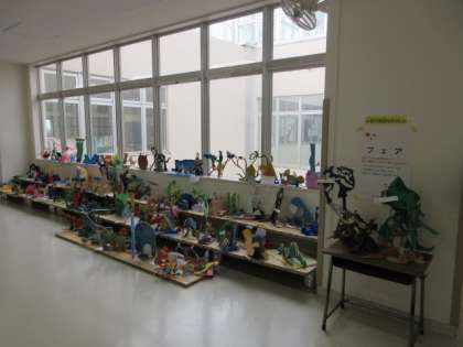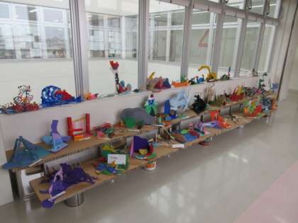 5年生が図画工作の時間に取り組んできた「糸のこドライブ」。作品が完成し、4階の植物階段近くに展示されています。1枚の板が様々な形に変化しました。