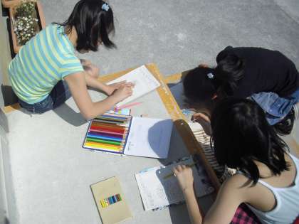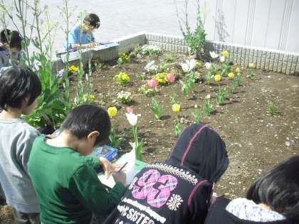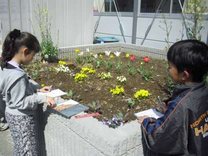 3年生の理科の授業の様子です。春の花を見つけて観察カードに記録しているところです。BOP前の花壇にはチューリップやパンジーなどがきれいにさいていました。日差しも暖かく、子どもたちも楽しく観察していました。