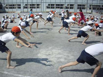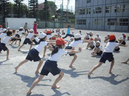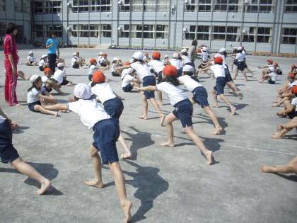 4年生の体育の授業の様子です。学年合同で、運動会に向けて「ソーラン節」に取り組み始めたところです。基本となる動きの確認をしていました。元気なかけ声が校庭に響いていました。