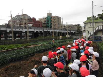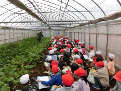 13日(水)の3・4時間目、3年生は社会科の学習の一環として農園見学に行きました。今回は、3組、4組、5組の子どもたちがうかがいました。1組と2組は、12日(火)でした。畑やビニールハウスの中を見せていただきながら、野菜を育てる喜びや気を付けていることなどのお話をしていただきました。