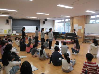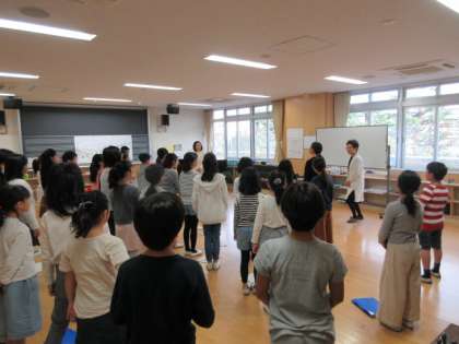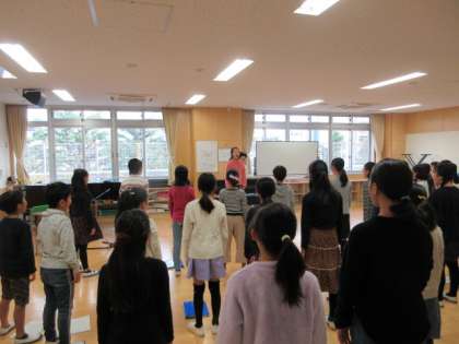 15日(金)の朝、合唱団の練習がありました。今回は、交流のある赤堤小学校の音楽の先生が来校されました。子どもたちはとても喜び、いつも以上に張り切っていました。発声練習のあと、「やさしい風」を歌いました。