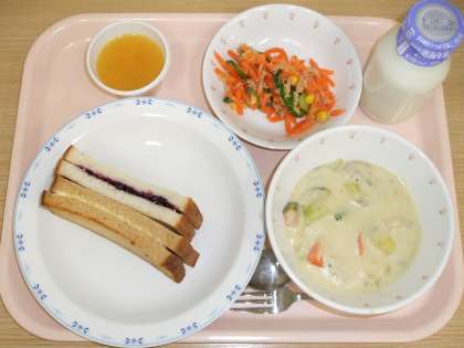 今日のサンドイッチは、2種類の味を楽しみました。黒砂糖パンにはクリームチーズを、ミルクパンにはブルーベリージャムをはさみました。みなさんはどちらの味のサンドイッチがお好みでしたか。