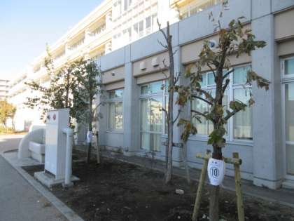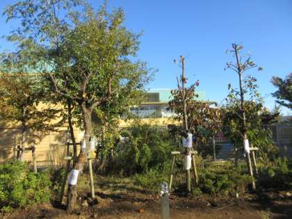 19日(火)までに40本を超える樹木が校庭側に移植されました。写真は、職員室前、ひかり学級前、畑周辺の様子です。移植された樹木には、順番を表すカードがついています。新しい環境でもしっかりと根付いてほしいです。