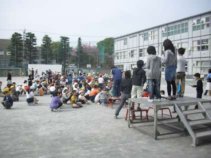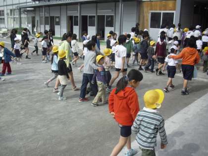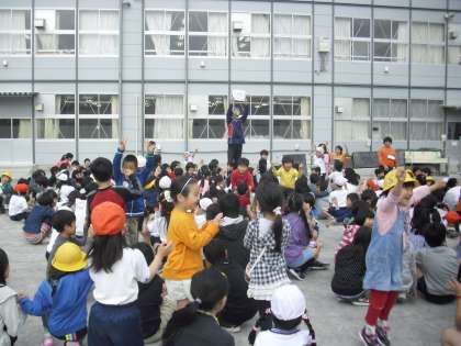 集会中も1年生は6年生といっしょに移動です。正解すると跳び上がって喜んでいました。教室に戻るときも1年生を6年生が送ってあげていました。微笑ましい光景です。
