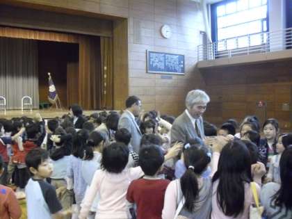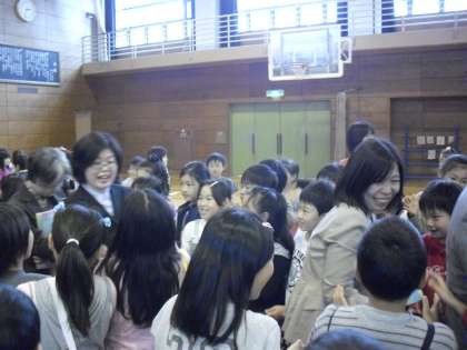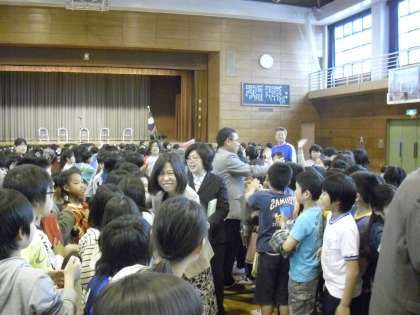 子どもたちの間を歩いて最後のお別れです。子どもたちとふれあいながらの退場となりました。ハイタッチをしたり、握手をしたり、お世話になった先生方とお別れをしました。これからも芦花小を見守っていてください。