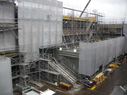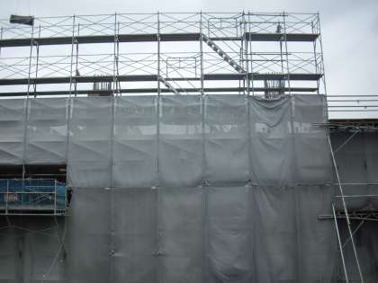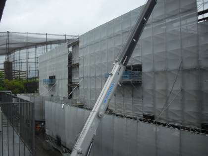 現在の新校舎建設工事の様子です。テニスコート裏は、4階部分までコンクリート工事が進んでいます。東側の校舎も3階部分までコンクリート工事が進みました。今日は強い雨と風の中での作業なので、安全に工事が進むことを願っています。