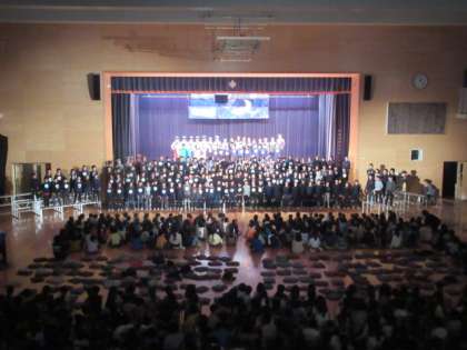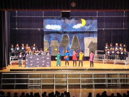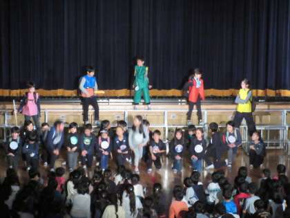 29日(金)、学芸会1日目。給食のあと、午後の部が始まりました。3年生の登場です。どろぼう学校の校歌を3年生全員で歌ったときの迫力が素晴らしく、見ている子どもたちを引き込んでいきました。