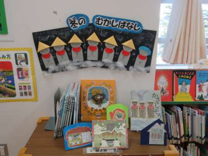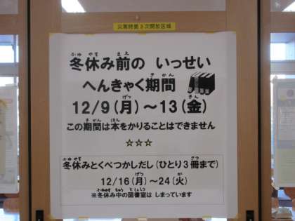 図書室に入ると「冬のむかしばなし」と題して本が紹介されていたり、新聞コーナーが設けられたりしています。また、9日(月)からの1週間は本の返却のみで貸出をしないというお知らせも掲示されています。