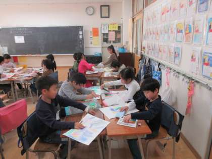 4日(水)の3・4時間目、1年1組は図画工作の時間でした。「うつしてあそぼう」と題して、でこぼこしているところをこすり出して、その形を楽しんでいました。「先生、見て見て」ととても嬉しそうでした。