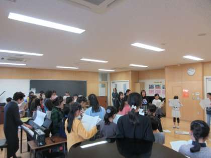 4日(水)の午後2時15分から、合唱団の放課後練習がありました。「シーラカンスをとりにいこう」の曲をアルト、ソプラノ、メゾに分けて歌いました。音程を確かなものにするために、同じパート同士で集まり、互いの声を聞き合いながら、最後に全員で通して歌いました。