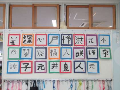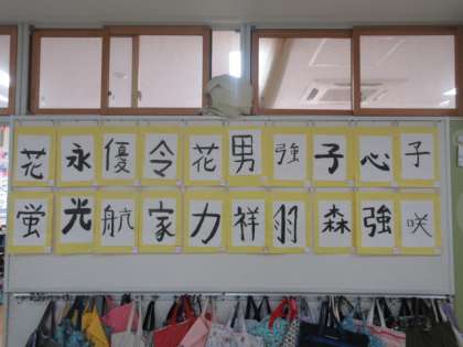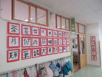 2年生の廊下には、教科「日本語」の時間に取り組んだ習字の作品が掲示されています。筆で線や文字を書く練習をしてから、その仕上げとして、ひらがなでも漢字でもよいので一文字を選んで書きました。