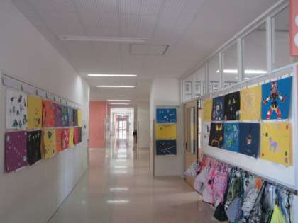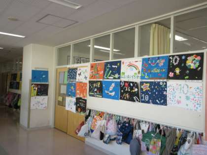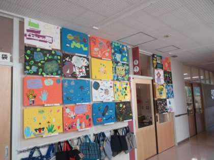4年生の廊下には、図画工作の時間に描いた作品が飾られています。「オリジナル・ペーパーワールド」と題して、身の回りのものを使った自分の色紙をつくりました。その色紙を切ったり重ねたりしています。