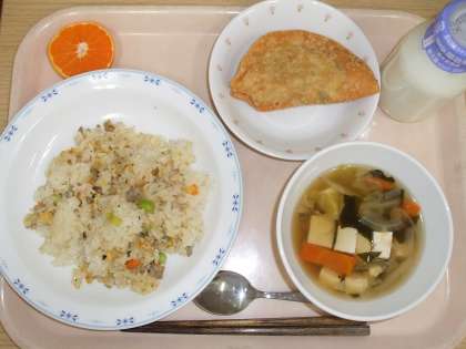 今日は「ジャンボぎょうざ」でした。ぎょうざと言えば、焼きぎょうざのイメージですが、今日は油で揚げて皮をパリパリに仕上げました。お皿からはみ出そうな大きなぎょうざは、子どもたちにも大人気でした。