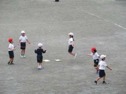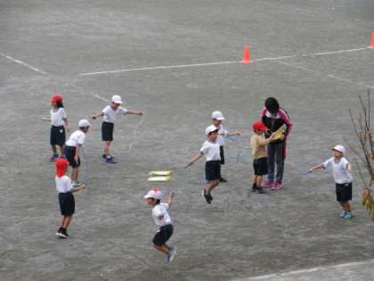 6日(金)の2時間目、1年5組は体育の時間でした。校庭でなわとびの練習をしていました。先生の話を聞いてから、各自で練習をしながら検定を受ける人もいました。