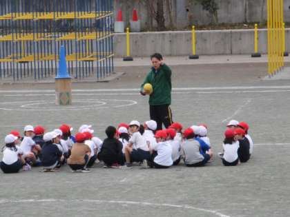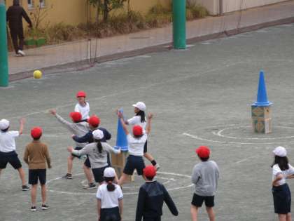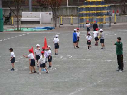 6日(金)の2時間目、3年5組は体育の時間でした。校庭でボールゲーム「パスドン」に取り組んでいました。先生の話を聞いてから、チームに分かれゲームを始めました。声を掛け合いながらボールを投げることができました。